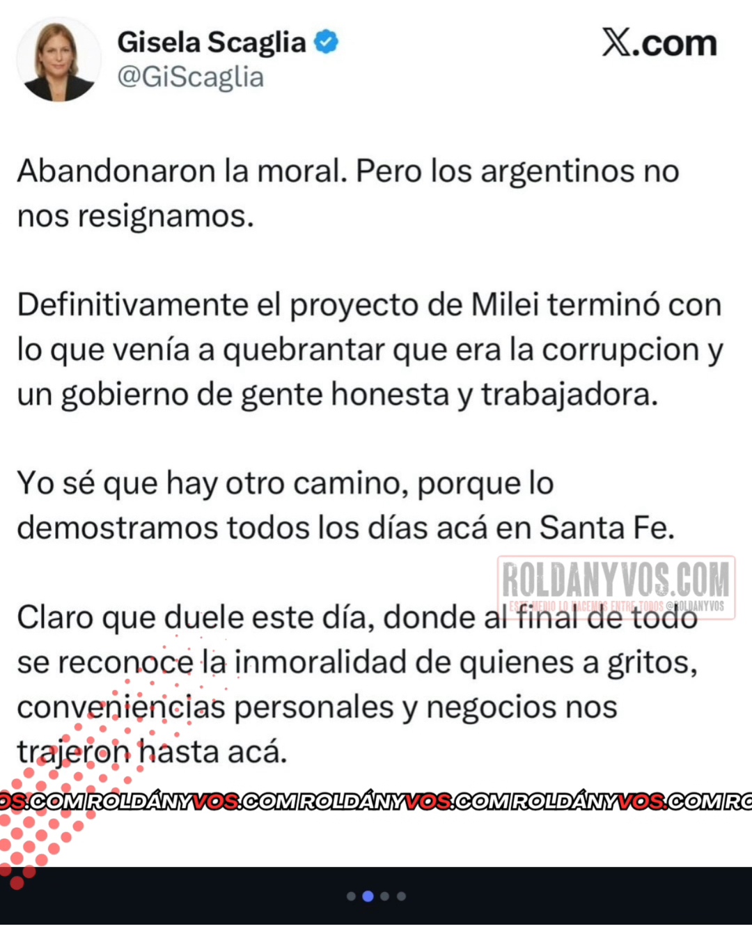 > “Abandonaron la moral. Pero los argentinos no nos resignamos. Definitivamente el proyecto de Milei terminó con lo que venía a quebrantar: la corrupción y un gobierno de gente honesta y trabajadora”, publicó Scaglia en su cuenta de X.