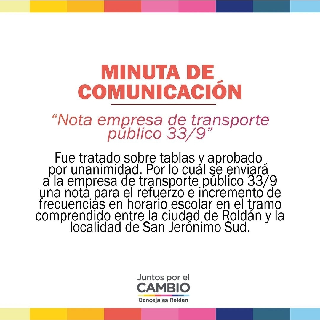 ▶️ "...En la sesión del pasado martes presentamos, Tratamos sobre tablas y se aprobó por unanimidad un proyecto de minuta de comunicación para pedir a la empresa de transporte público 33/9 refuerzo e incremento de frecuencias en horario escolar en el tramo comprendido entre la Ciudad de Roldán y la vecina localidad de San Jerónimo Sud. Además, se le enviara una nota a la secretaria de transportes de la provincia para que intervenga favorablemente en el tema y se le solicitó al ejecutivo municipal que acompañe el requerimiento..."