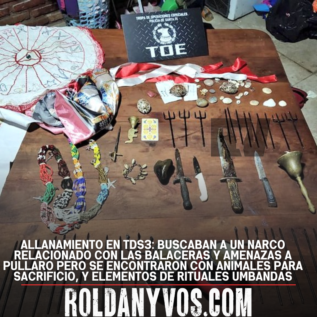 "...Uno de los allanamientos de ayer del MPA se hizo en una casa en Tierra de Sueños 3, Roldán. Buscaban a un narco presuntamente relacionado con balaceras y amenazas al gobernador en Rosario. Se encontraron con animales preparados para el sacrificio y elementos de rituales Umbanda...."