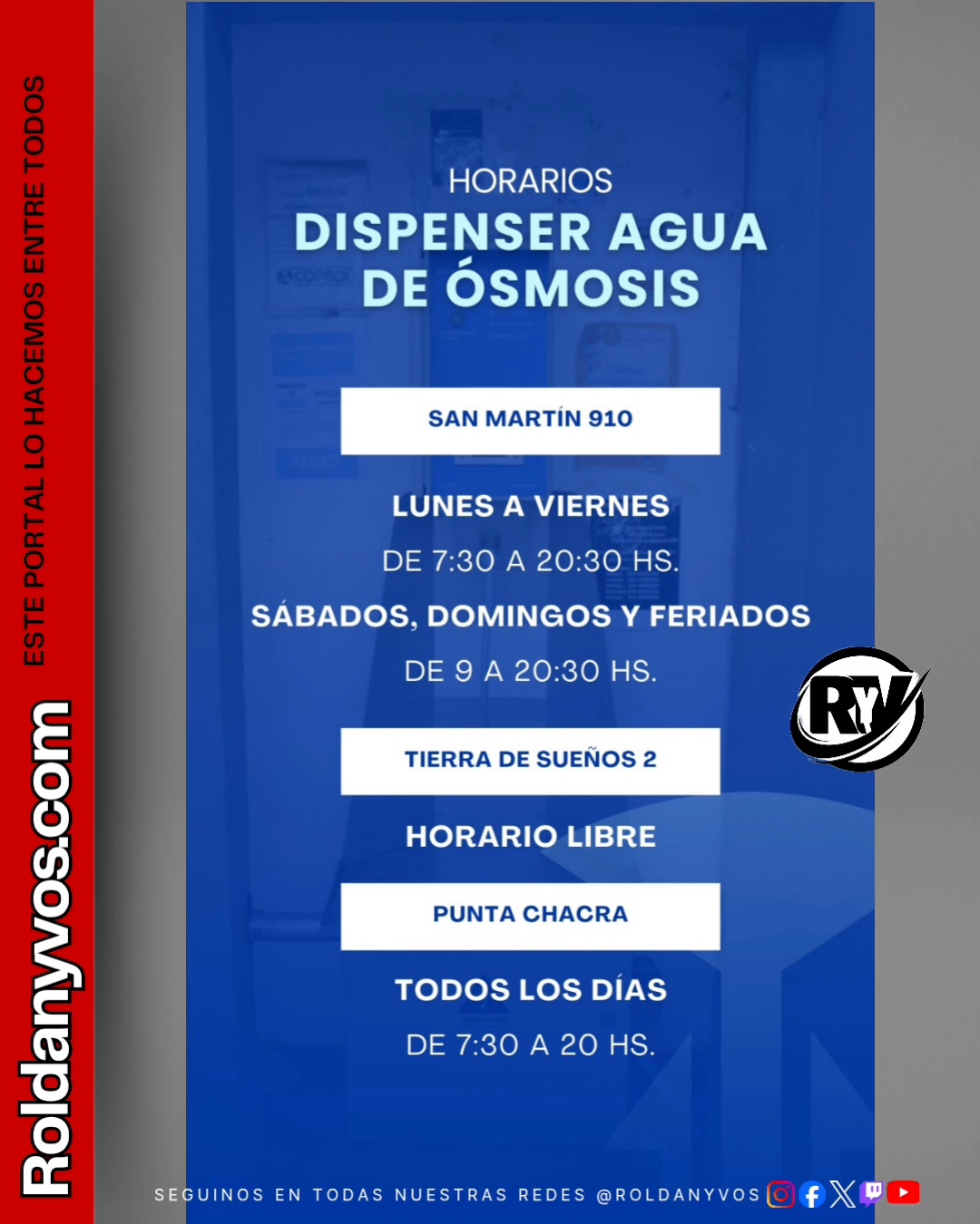 La Cooperativa COPROL @coprolroldan actualizó los horarios de funcionamiento de sus dispensers de agua de ósmosis en distintos puntos de la ciudad. A continuación, el detalle para que los vecinos puedan organizarse: