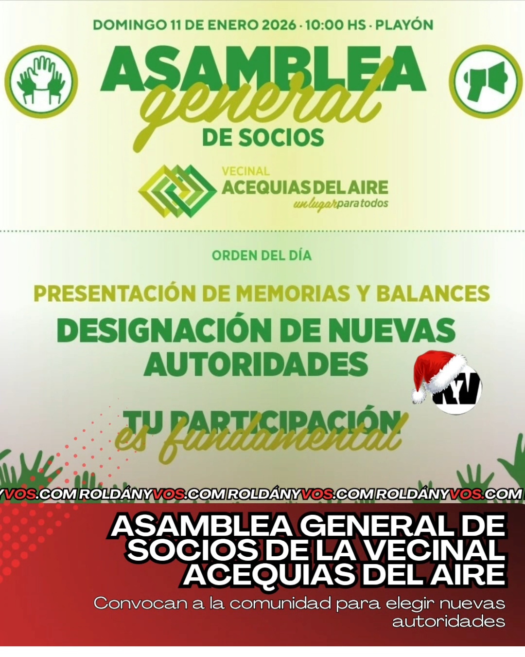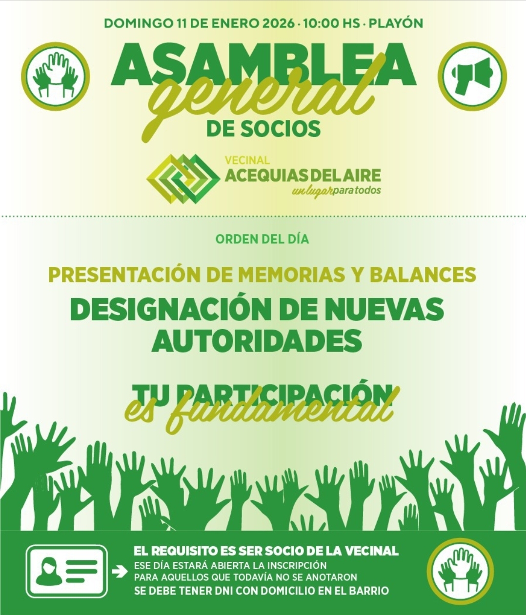 La Vecinal Acequias del Aire convoca a todos los vecinos a participar de la Asamblea General de Socios, que se realizará el domingo 11 de enero de 2026, a las 10:00 hs, en el playón del barrio.