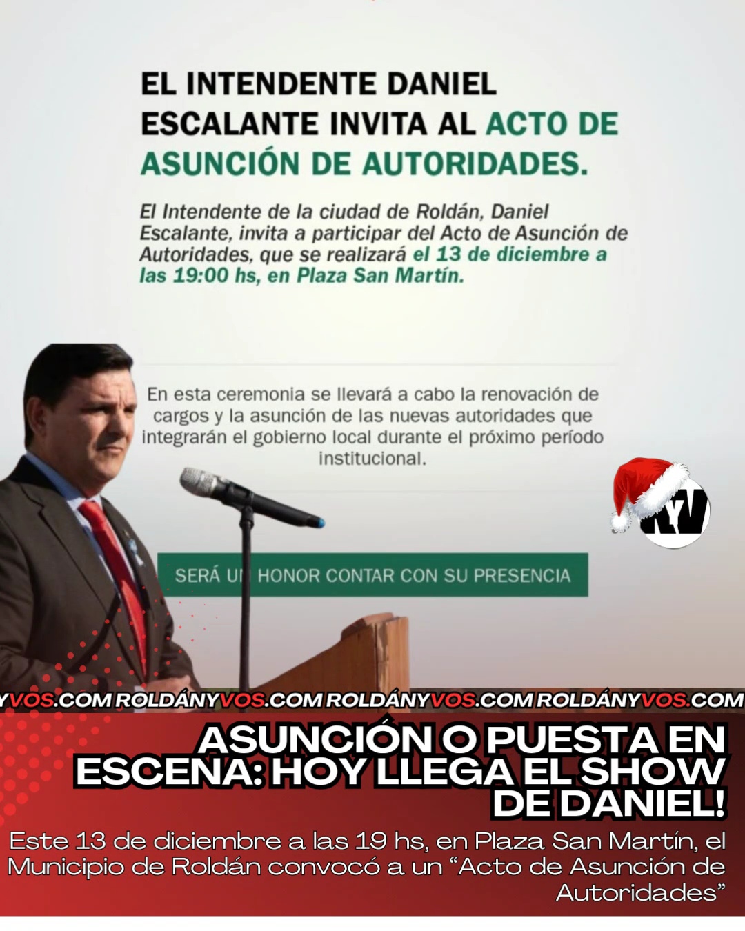Este Sábado 13 de diciembre a las 19 hs, en Plaza San Martín, el Municipio de Roldán convocó a un “Acto de Asunción de Autoridades” encabezado por el intendente Daniel Escalante. Sin embargo, el anuncio genera más dudas que certezas, ya que la renovación del mandato del intendente ya se concretó días atrás, lejos de la plaza y de los vecinos.
