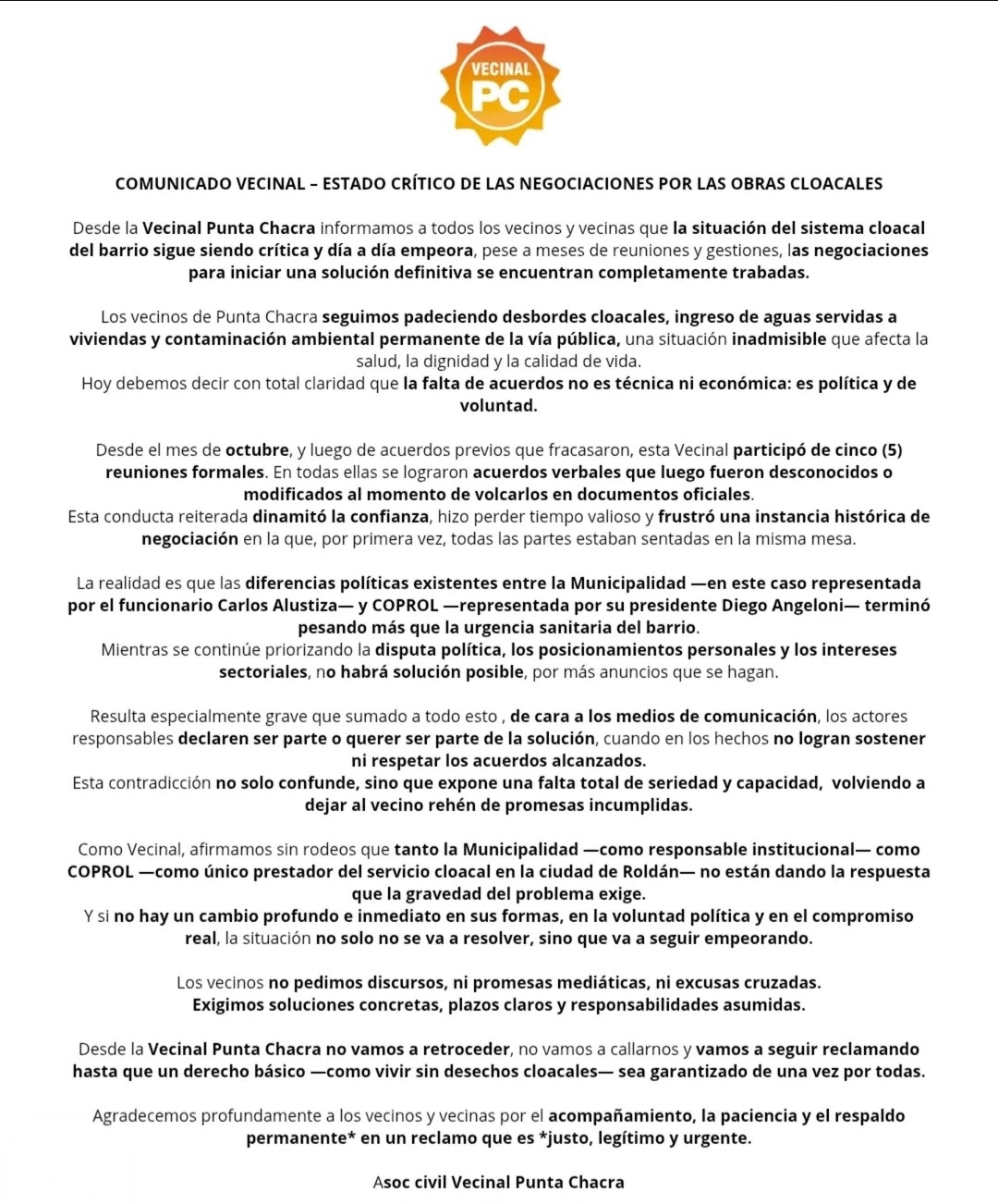 La Vecinal Punta Chacra difundió un duro comunicado en el que advierte que la situación del sistema cloacal del barrio continúa siendo crítica y empeora día a día, mientras que las negociaciones para iniciar una solución definitiva se encuentran completamente trabadas.