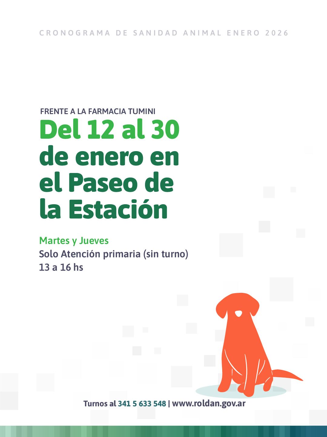 La Municipalidad de Roldán informó el cronograma de Sanidad Animal correspondiente a enero de 2026, que se llevará adelante del 12 al 30 de enero en el Paseo de la Estación, frente a la Farmacia Tumini.