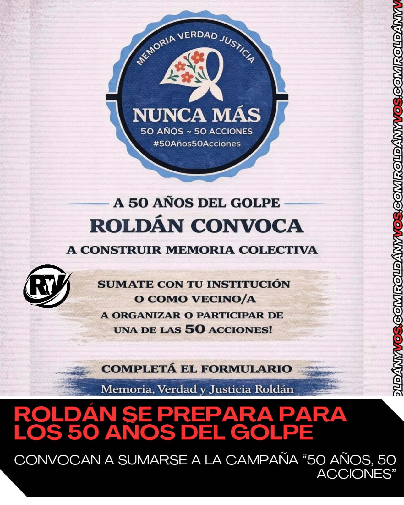 Desde el Espacio Memoria, Verdad y Justicia de Roldán ya se comenzó a trabajar en este aniversario tan significativo. La propuesta es impulsar 50 acciones durante todo el mes de marzo, adaptadas a las posibilidades y características locales, en articulación con iniciativas que se llevarán adelante en todo el país bajo el lema #50Años50Acciones.