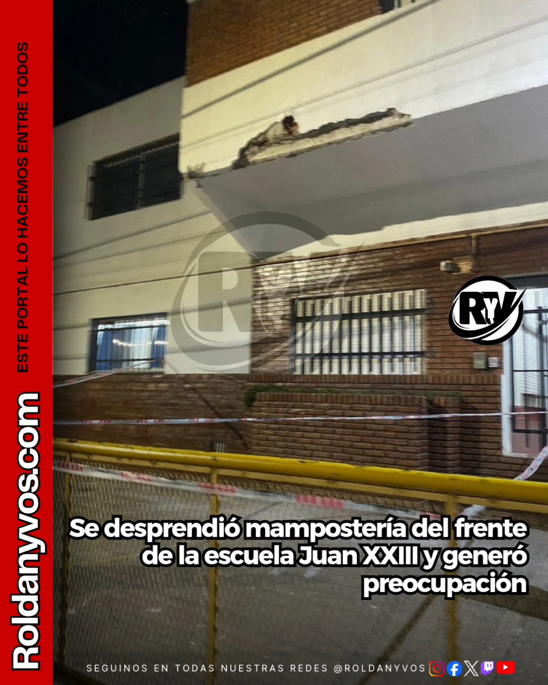 Un episodio que generó preocupación se registró en la tarde de este miércoles en Roldán, cuando se desprendió parte de la mampostería del frente de la escuela Juan XXIII, ubicada sobre Bv. López al 900.