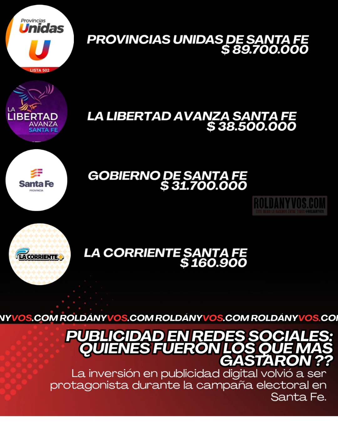 ✅️ Por otra parte, el espacio La Corriente Santa Fe registró $160.900, mientras que el Frente Amplio por la Soberanía, junto a Luciano Rossi, Eugenio Malaponte y Ciudad Futura, no declararon inversión en redes durante ese período.