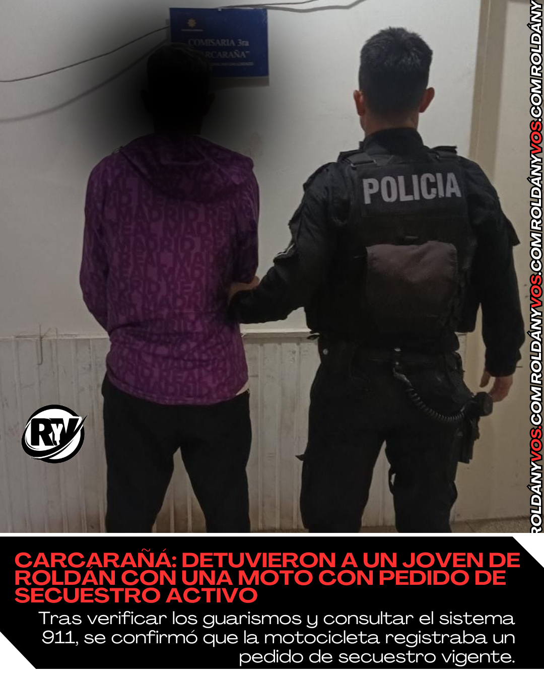✅️ Un joven de 19 años domiciliado en Roldán fue detenido en la madrugada de este lunes en Carcarañá, tras ser interceptado mientras circulaba en una motocicleta que tenía pedido de secuestro activo.