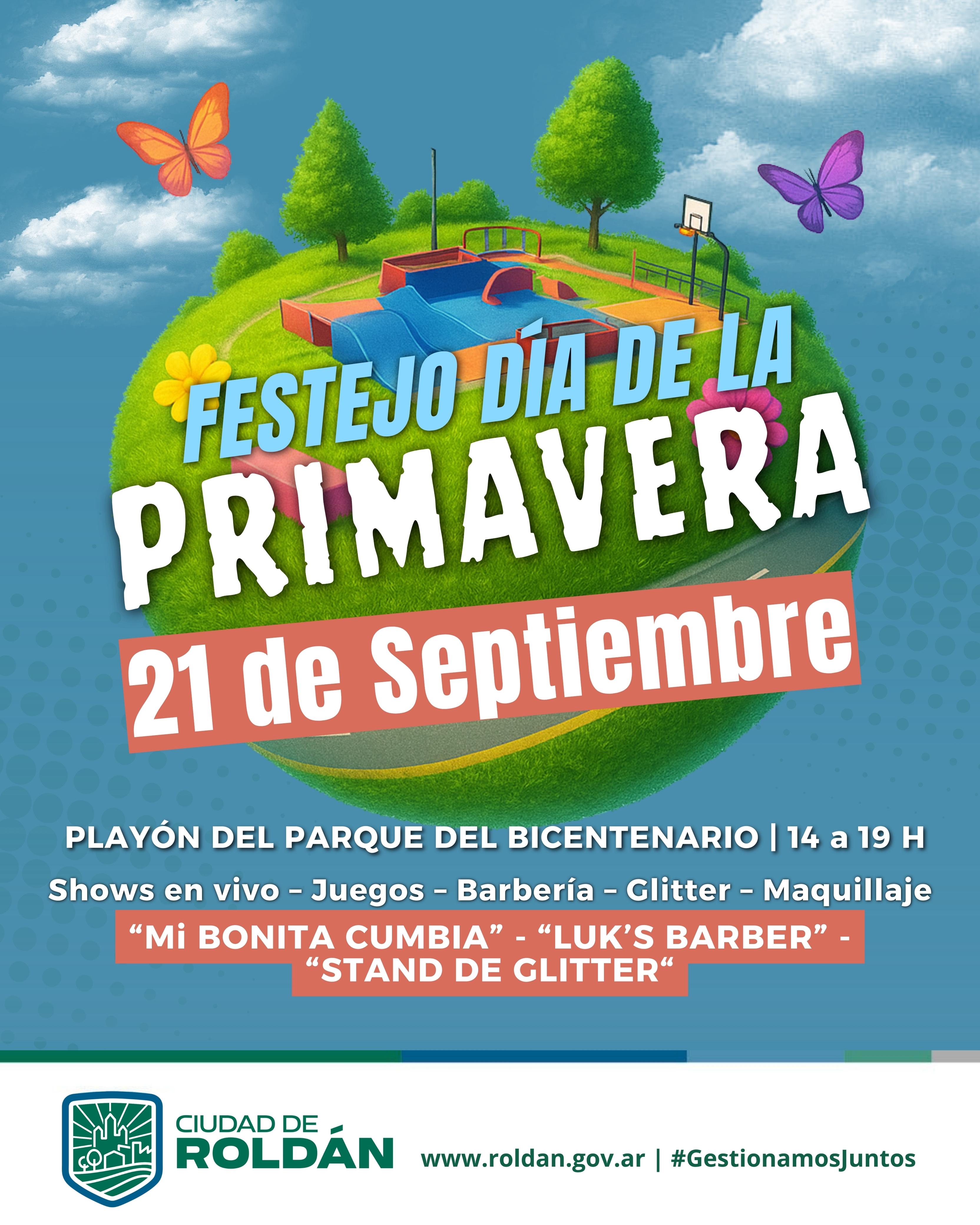 La Municipalidad de Roldán invita a la comunidad a compartir una jornada especial para dar la bienvenida a la primavera. El próximo 21 de septiembre, de 14 a 19 horas, se realizará el Festejo de la Primavera en el Playón del Parque del Bicentenario, con entrada libre y gratuita.