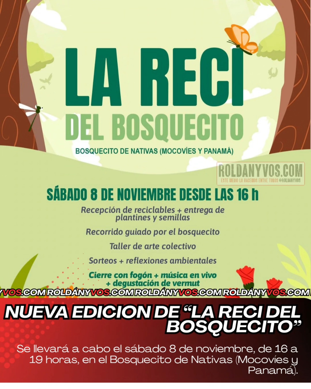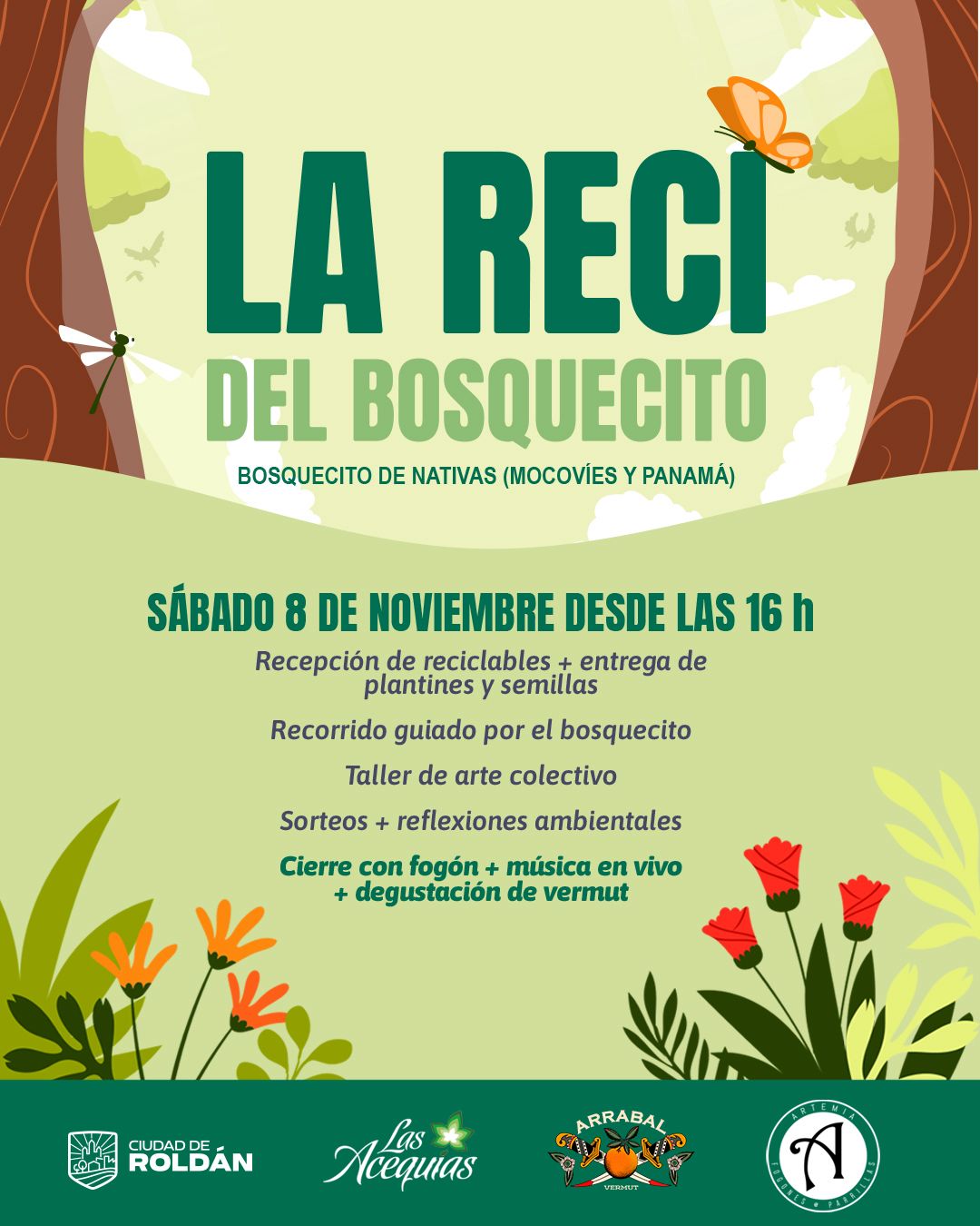 La Municipalidad de Roldán, a través de la Subsecretaría de Medio Ambiente, junto a la Vecinal de barrio Las Acequias, invita a la comunidad a participar de una nueva edición de “La Reci del Bosquecito”, que se llevará a cabo el sábado 8 de noviembre, de 16 a 19 horas, en el Bosquecito de Nativas (Mocovíes y Panamá).