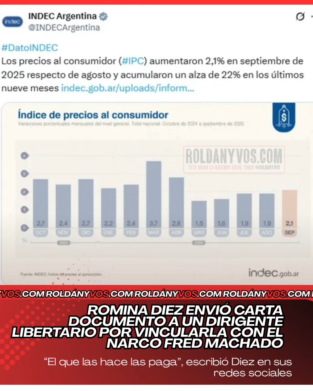 ▶️ El Instituto Nacional de Estadística y Censos (INDEC) informó este martes que la inflación correspondiente a septiembre fue del 2,1%. De esta manera, el Índice de Precios al Consumidor (IPC) acumula un 31,8% interanual. El incremento con respecto a agosto es inesperado para el Gobierno, que asegura que la inflación "desaparecerá".