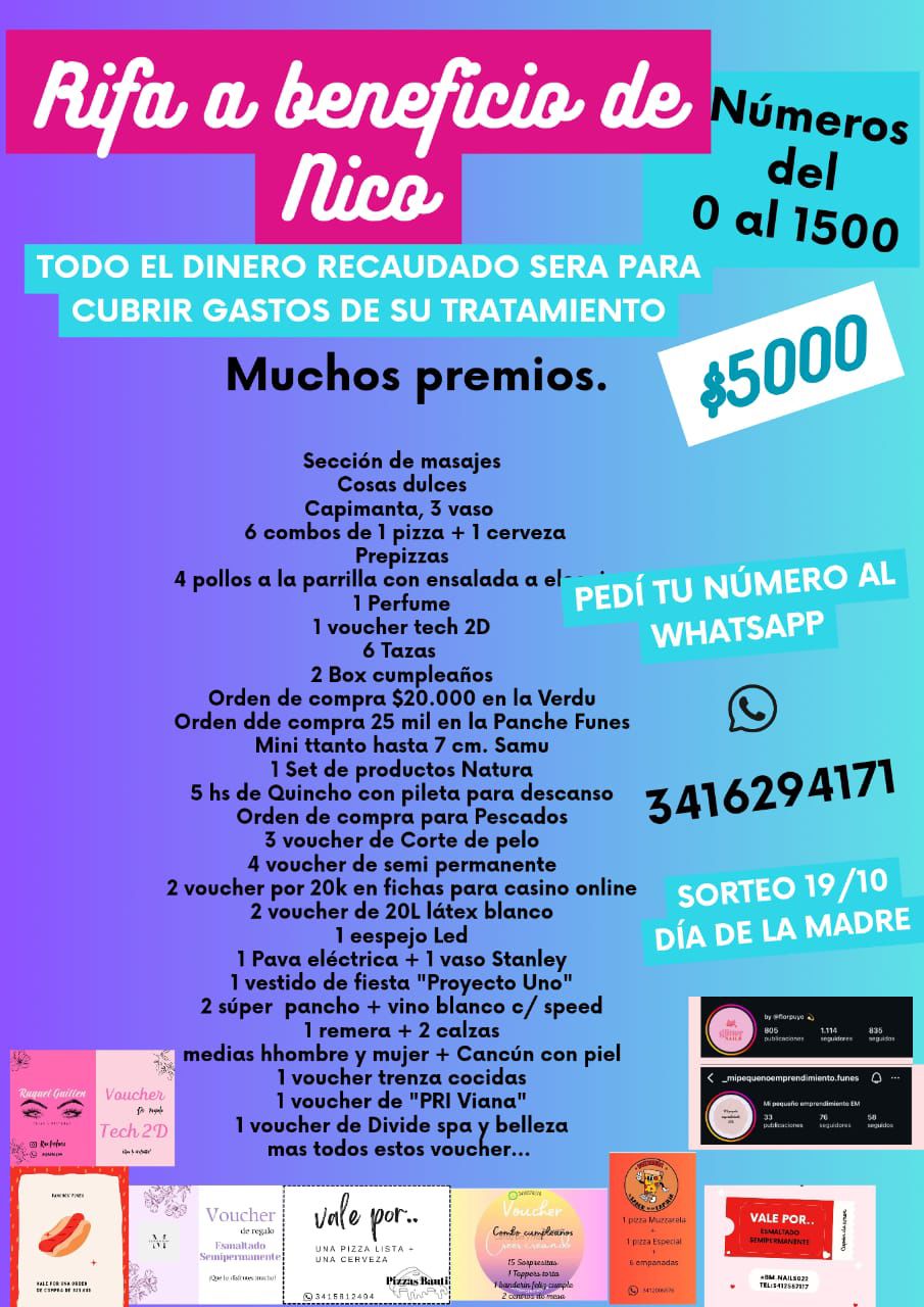 Para afrontar estos gastos se lanzó una rifa solidaria con más de 30 premios que incluyen órdenes de compra, comidas, sesiones de masajes, productos de belleza, ropa, accesorios y mucho más.