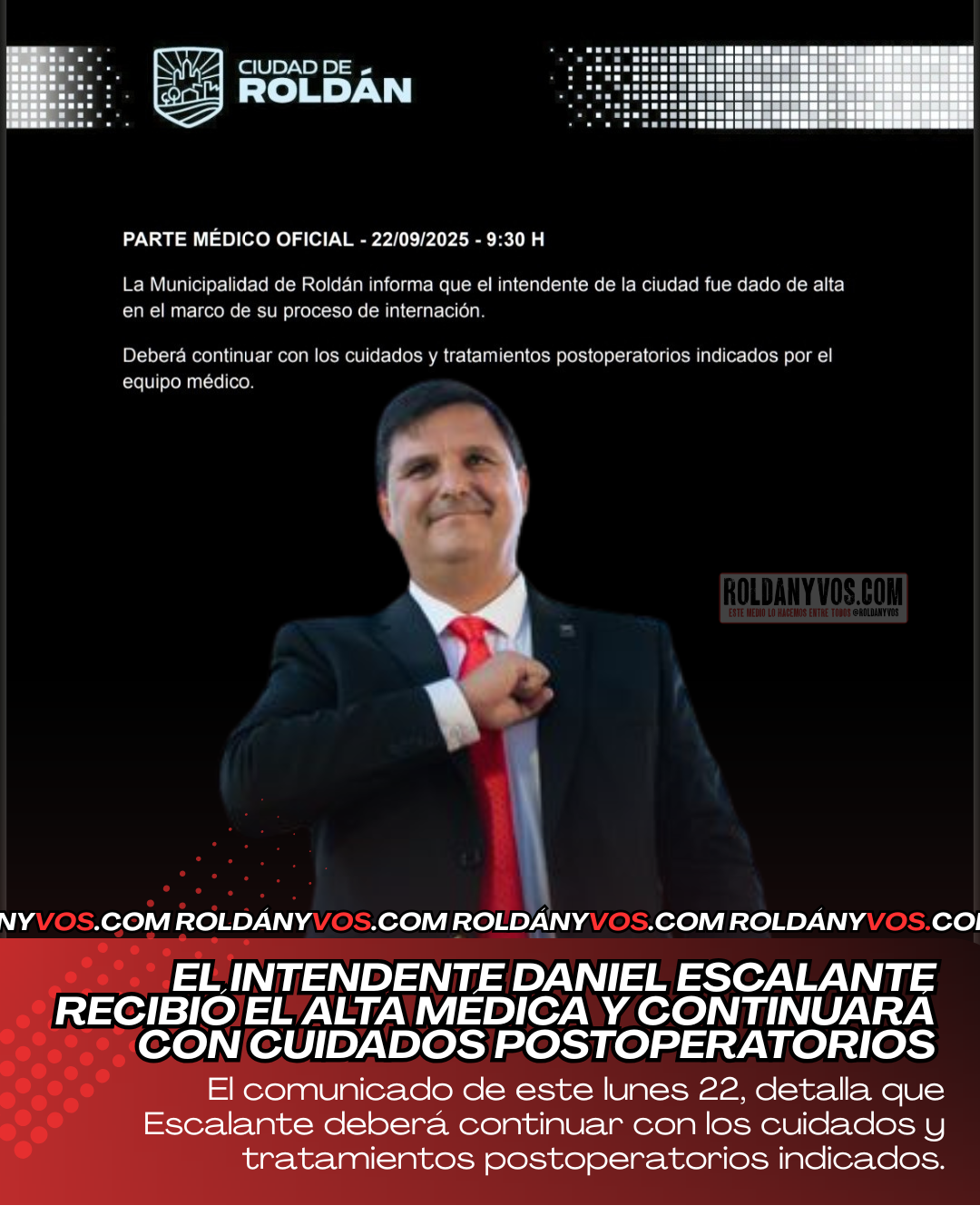 La Municipalidad de Roldán informó esta mañana, a través de un parte médico oficial, que el intendente de la ciudad, Daniel Escalante, fue dado de alta en el marco de su proceso de internación.