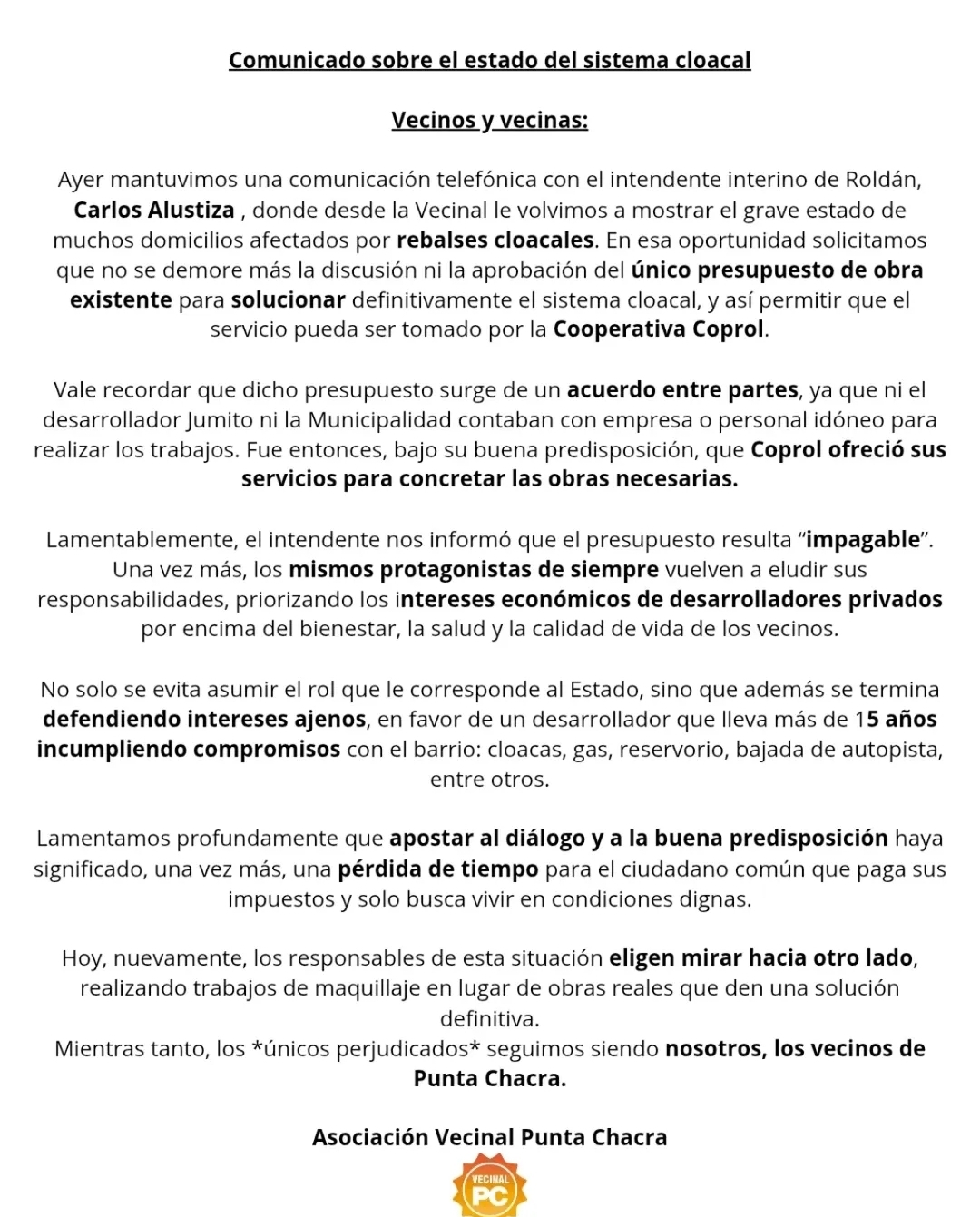 > “Mientras tanto, los únicos perjudicados seguimos siendo nosotros, los vecinos de Punta Chacra”, concluye el texto firmado por la Asociación Vecinal Punta Chacra.
