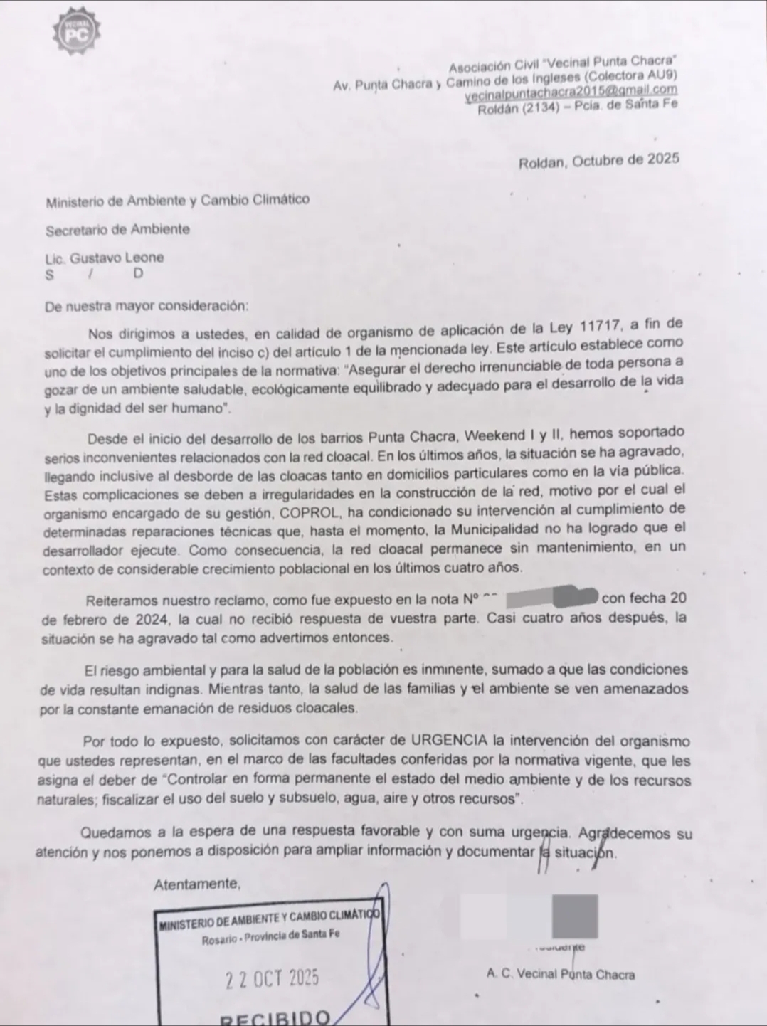 ✅️ La Asociación Civil Vecinal Punta Chacra @vecinalpuntachacraroldan realizó una nueva presentación ante el Ministerio de Ambiente y Cambio Climático de la Provincia de Santa Fe, reiterando el pedido de intervención urgente para revertir el grave daño ambiental que afecta al barrio a causa del constante derrame de aguas servidas en la vía pública.