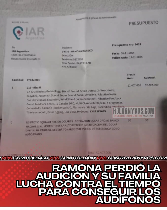 El presupuesto emitido por IAR Argentina indica que el costo total de los dispositivos asciende a $2.407.000, una cifra imposible de afrontar para su familia sin ayuda.