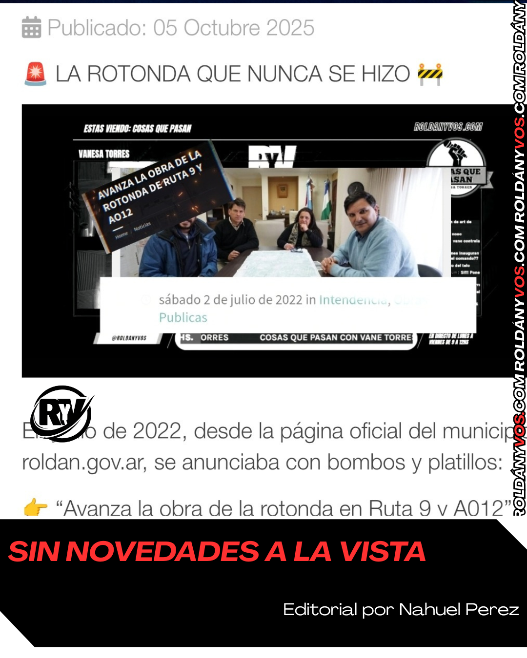✅️ En Roldán seguimos esperando. Mientras el tránsito se vuelve cada vez más peligroso en el cruce de la A012 y la Ruta 9, la obra de la rotonda que se anunció con bombos y platillos en 2022 quedó archivada en algún escritorio provincial. “ES UN HECHO, SE REALIZARÁ LA ROTONDA”, titulaban entonces varios medios, repitiendo las palabras de campaña de quienes hoy gobiernan. Sin embargo, la realidad es otra: la traza está destrozada, los accidentes se repiten y nadie da una respuesta concreta.