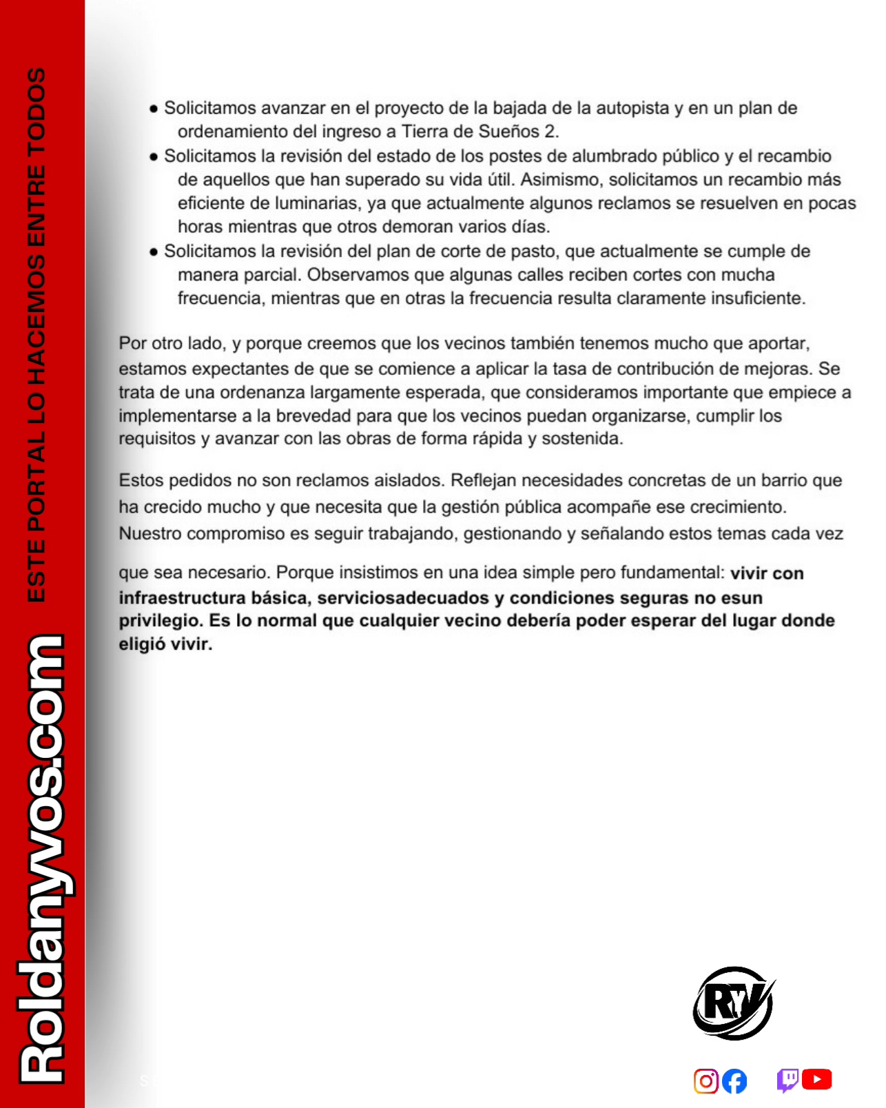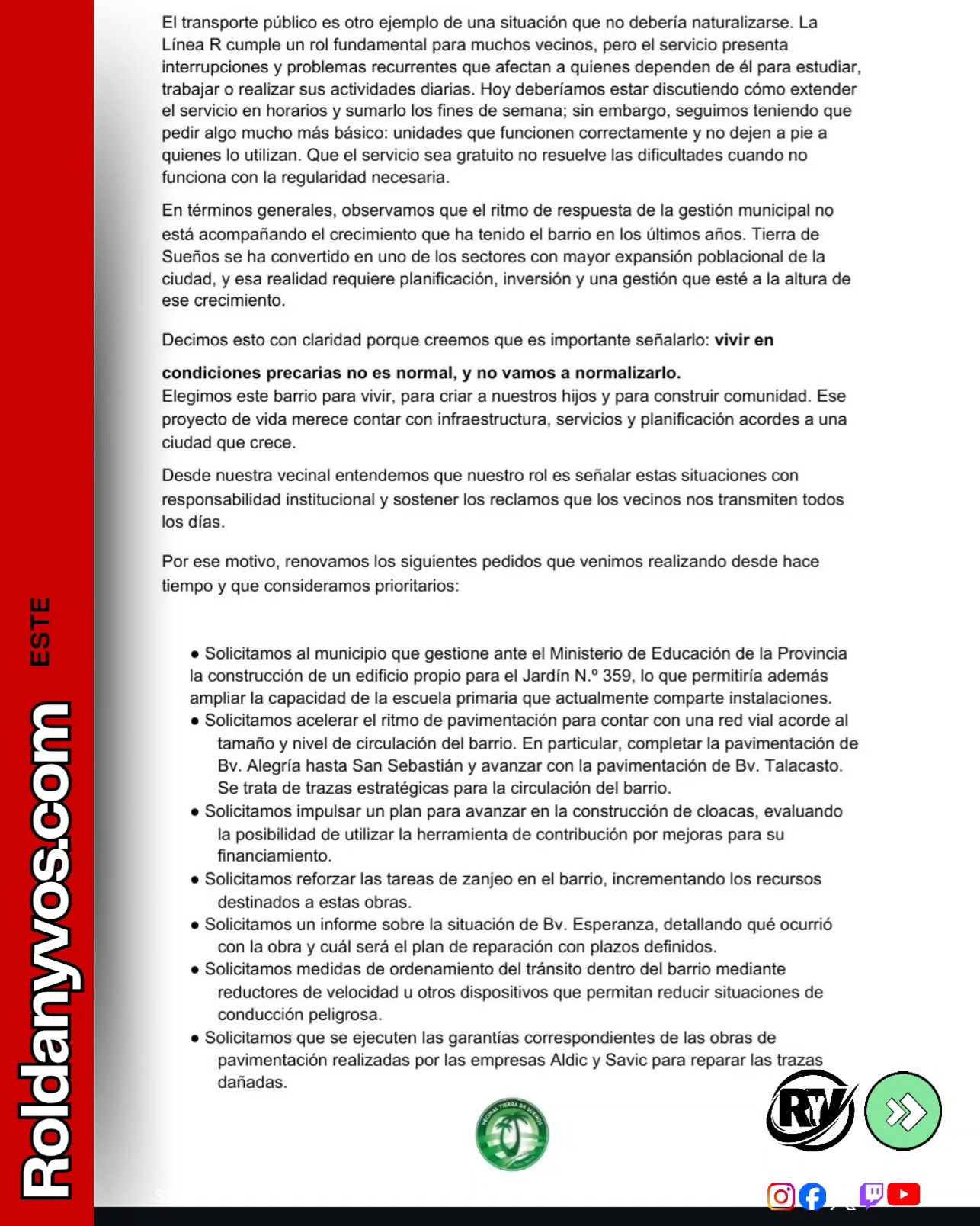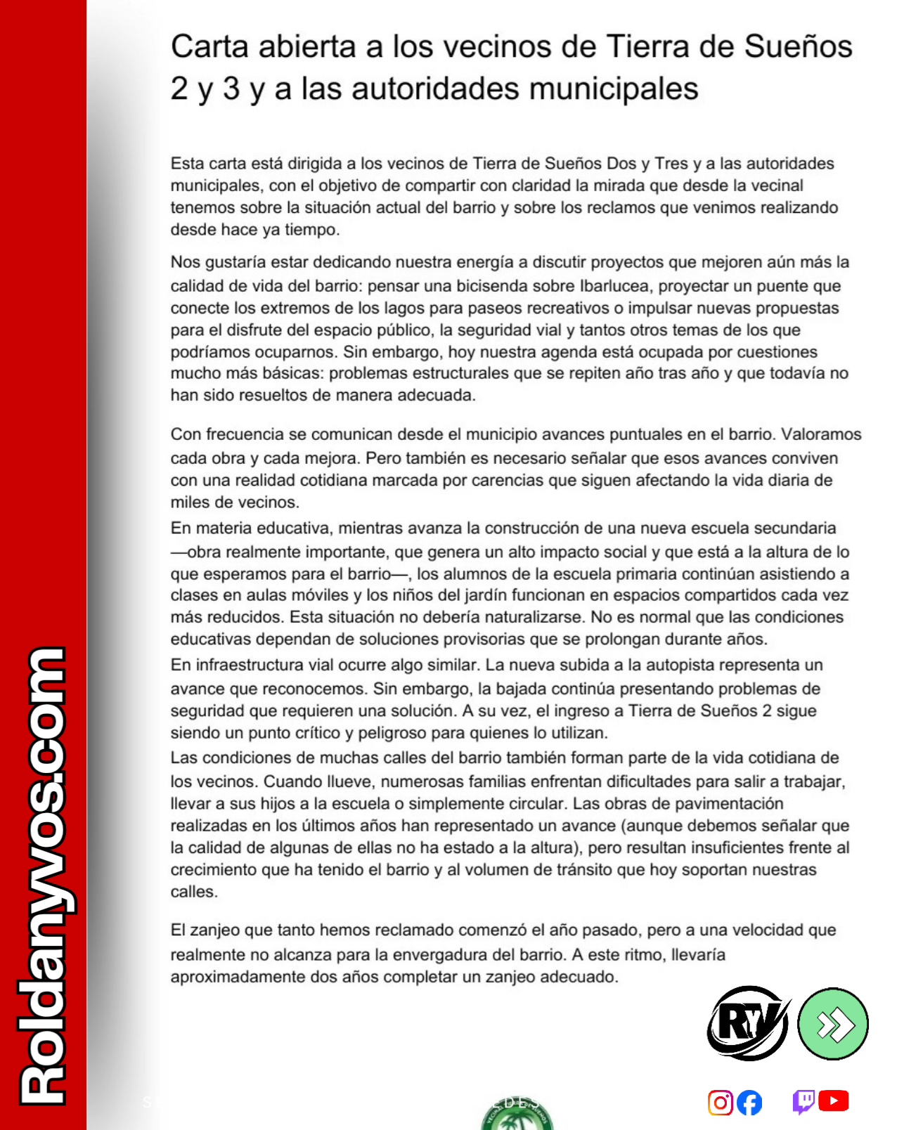 La Asociación Civil Vecinal de Tierra de Sueños 2 y 3 difundió una carta abierta dirigida a vecinos y autoridades municipales donde expone su preocupación por distintos problemas que afectan al barrio y reclama avances en infraestructura, servicios y planificación.