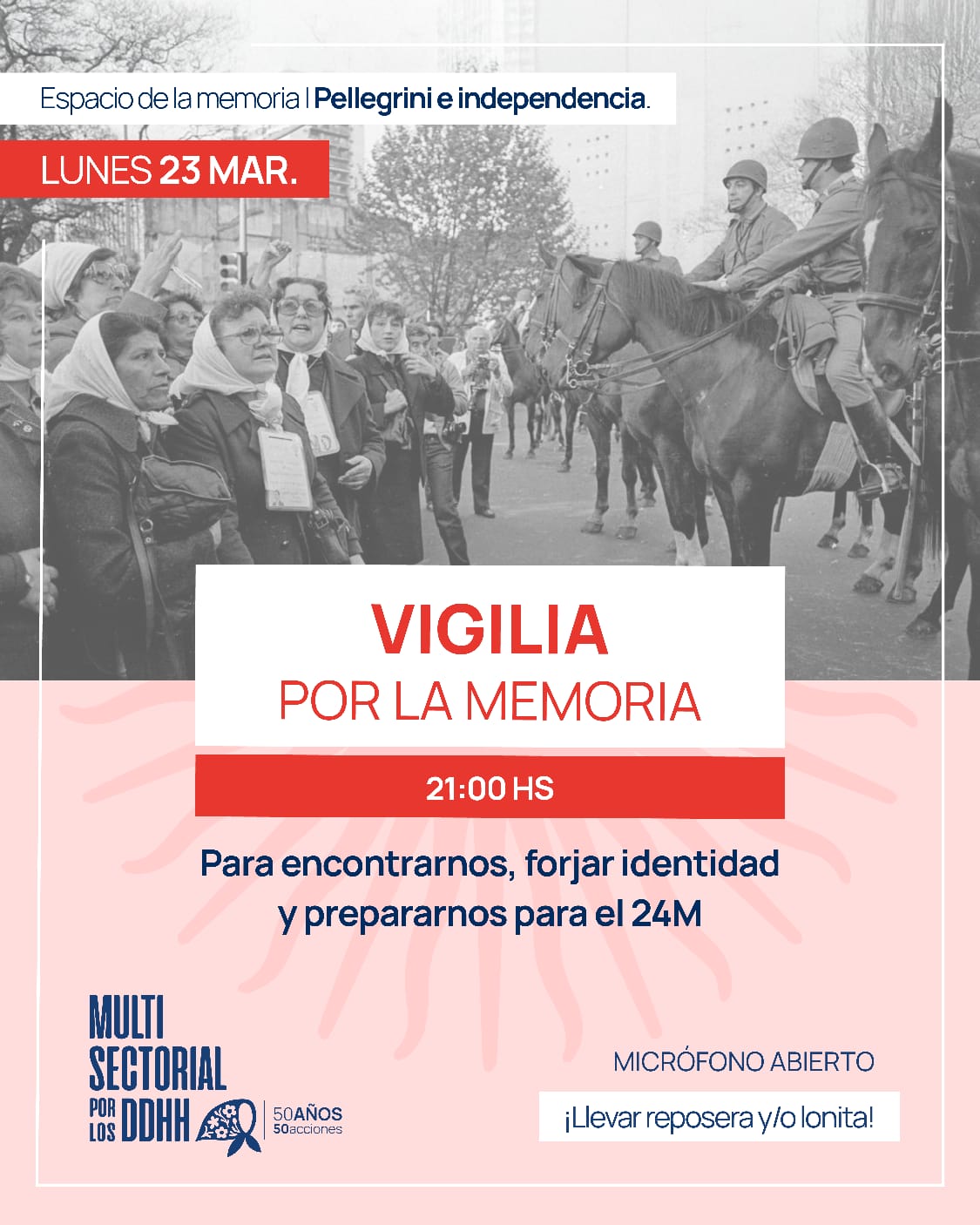 La convocatoria es impulsada por la Multisectorial por los Derechos Humanos, en el marco de las acciones a 50 años del último golpe de Estado en Argentina.