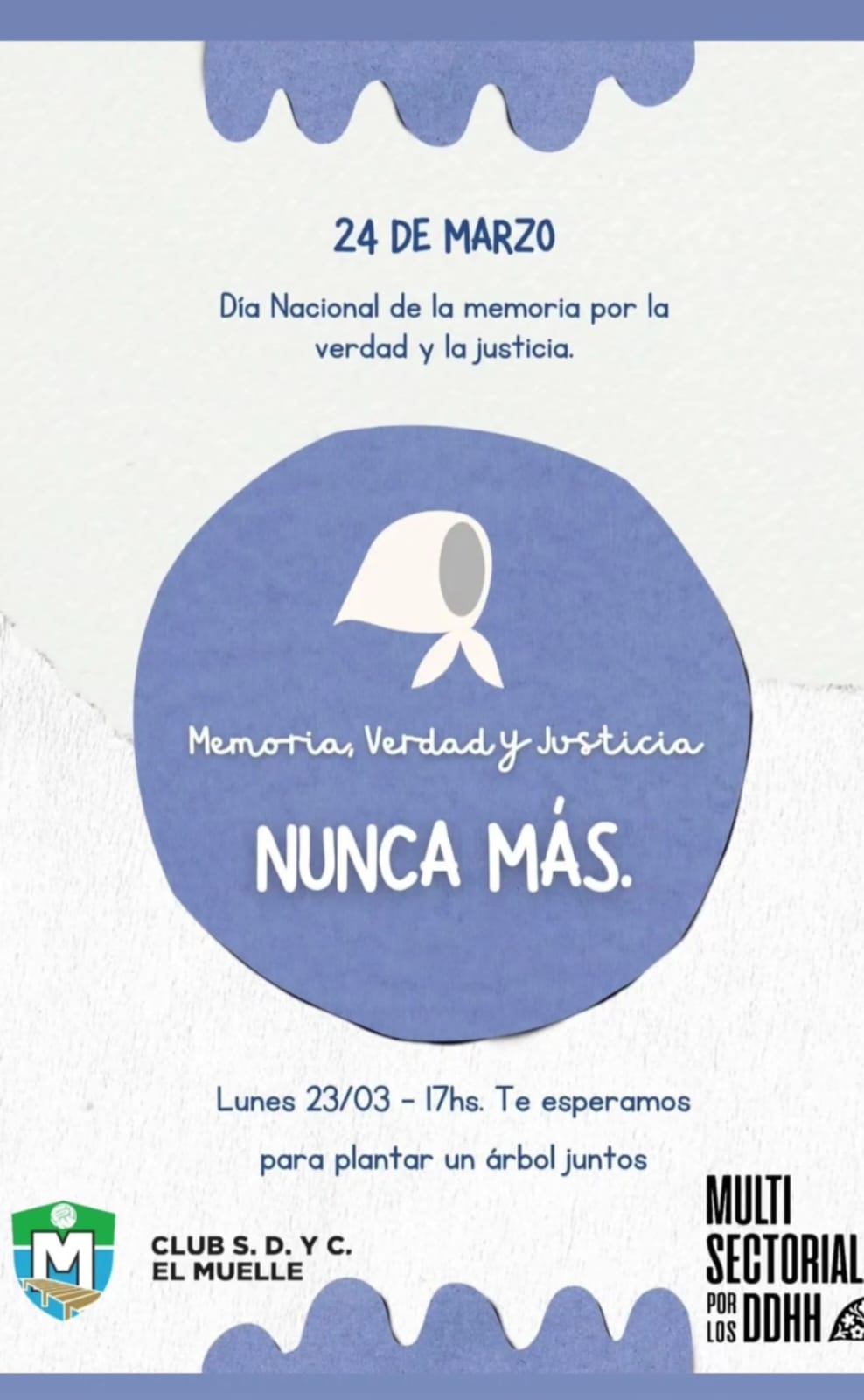 Este lunes 23 de marzo a las 17:00 horas, se realizará una jornada de memoria en el Club S.D. y C. El Muelle @clubelmuelle donde vecinos y vecinas están invitados a participar de la plantación de un árbol como símbolo de memoria, vida y compromiso colectivo.