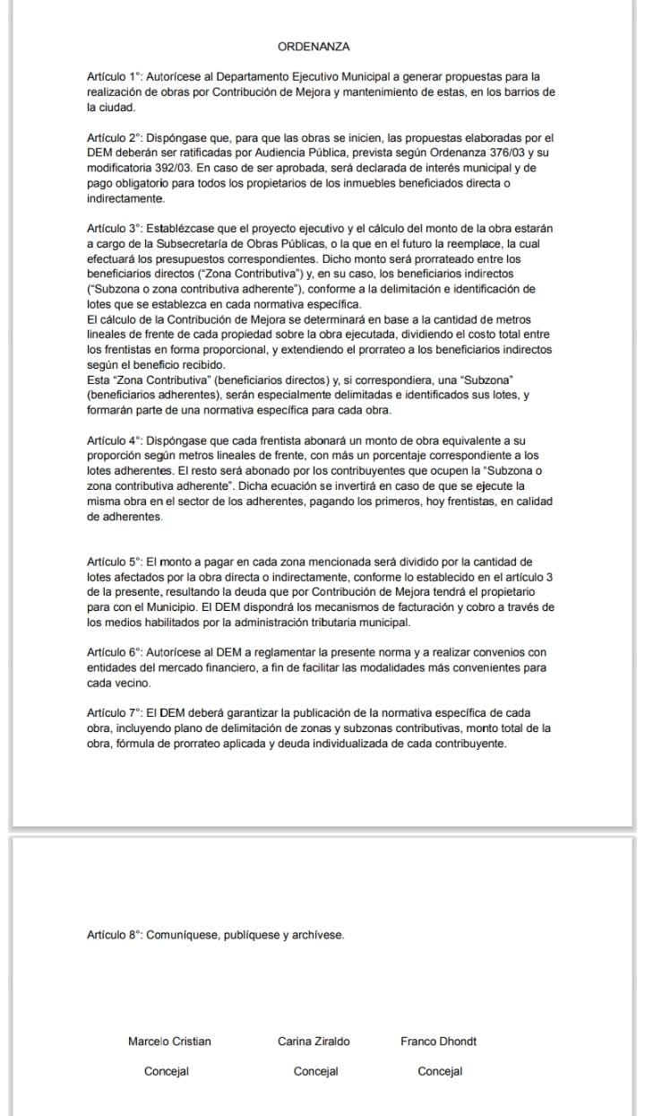 Sin embargo, detrás de estas obras —que sin dudas son necesarias y esperadas por los vecinos— aparece un dato que genera malestar: el Ejecutivo impulsa un proyecto de Ordenanza de “Contribución de Mejoras” para que los frentistas comiencen a pagar por los trabajos.