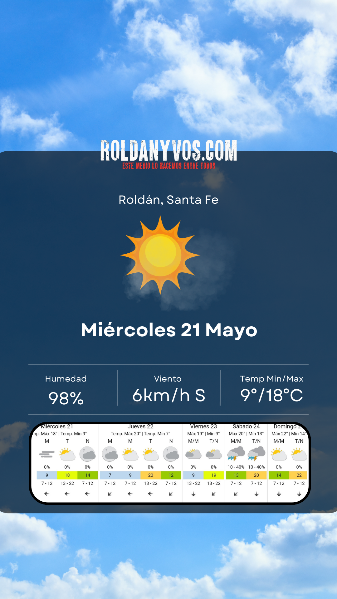 👉 Con 9° de minima la Sensación termica es bastante menos, apenas 6° , bien abrigados para comenzar el día, la máxima esperada es el 18° con un cielo casi casi despejado.