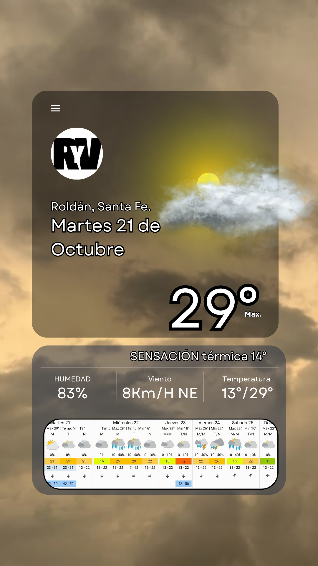 ✅️ Este Martes 21 de Octubre viene acompañado con sol en la mañana pero......pero para la tarde comienzan a llegar las nubes para darle paso a un miércoles....inestable 🌦.... Para hoy la máxima esperada es de 29° con viento del norte prácticamente toda la jornada.