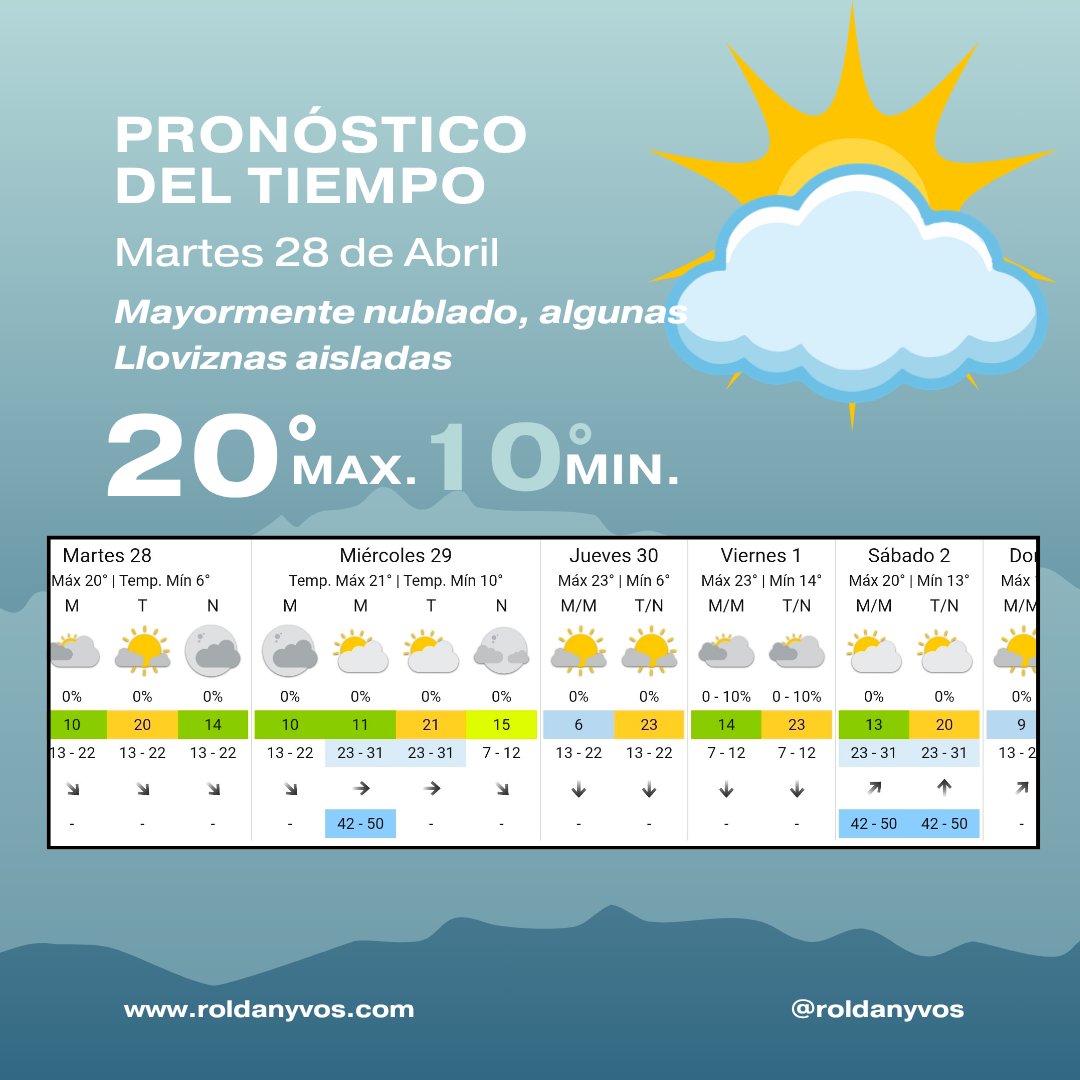 El martes 28 de abril comenzó en Roldán con una mañana fría, cielo mayormente cubierto y un escenario de tiempo variable que podría presentar distintas condiciones a lo largo del día. Entre el abrigo, el mate y la incertidumbre del pronóstico, la jornada tendrá de todo un poco.